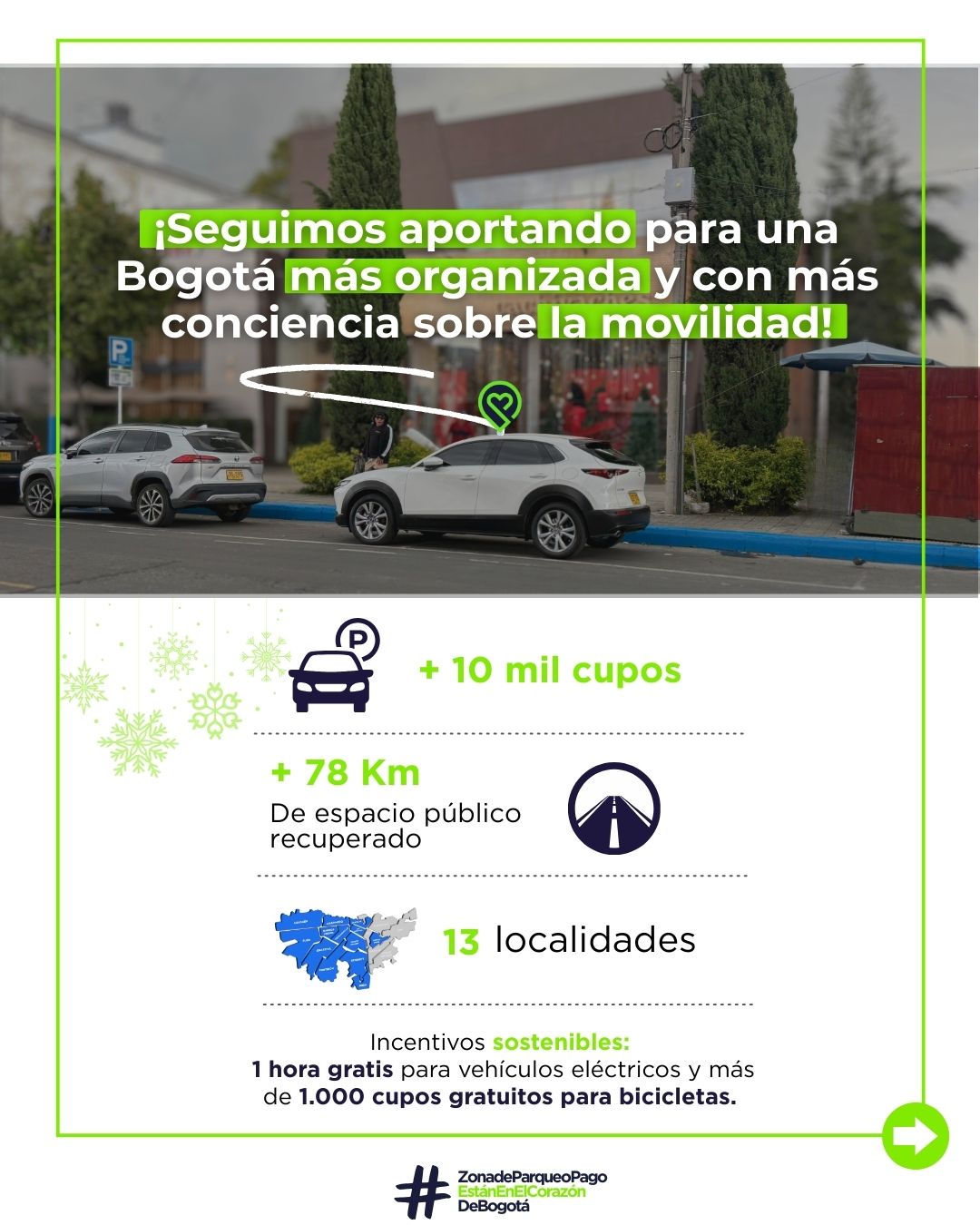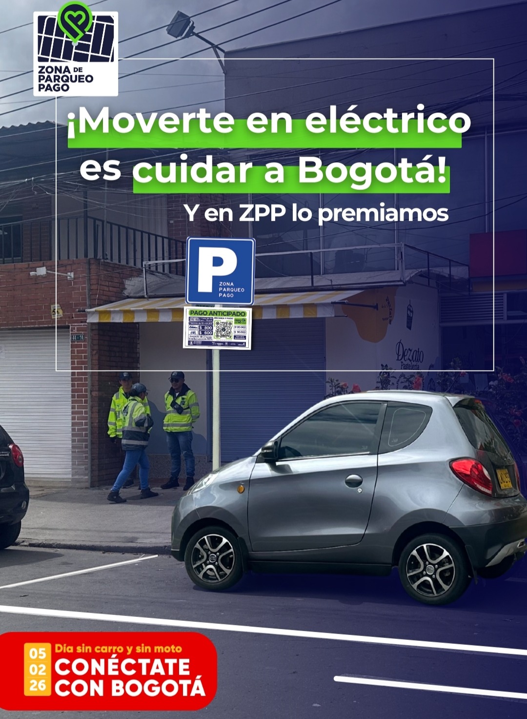 Apostarle a la movilidad eléctrica es contribuir a una Bogotá más limpia y sostenible. Por eso, en las Zonas de Parqueo Pago (ZPP) se reconoce este compromiso con un beneficio permanente: la primera hora de estacionamiento gratis para vehículos 100 % eléctricos, una medida que impulsa el uso responsable del espacio público y promueve una mejor calidad de vida en la ciudad.